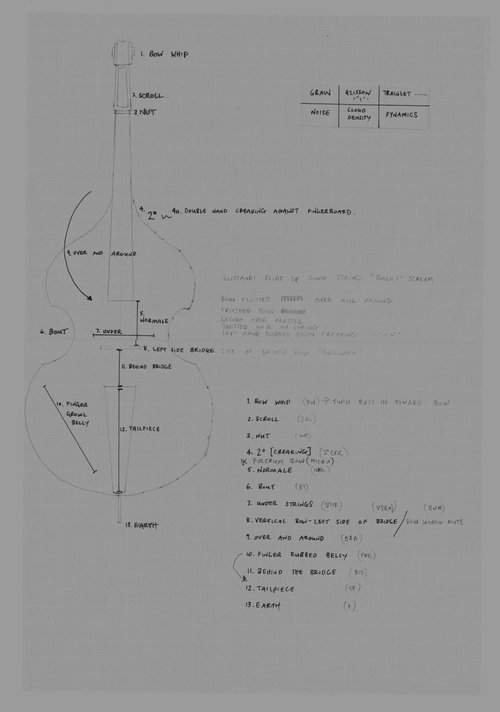 First, let's cover some factual details: Mark Cauvin, as mentioned before, is a double bassist from Australia, but he is also a psychiatric nurse. Although I've never had the opportunity to discuss with him the connections or contributions these two occupations have to each other, they both involve a similar image of "getting to grips with" something, whether it's a human body or an instrument, both of which are substantial and unwieldy (which is why double bassists often refer to their instrument as "the grandmother"). It's about literally taking it on, whether it's the patient or the instrument. For anyone in doubt, I recommend revisiting Joëlle Léandre's "Taxi" – another double bassist who has been grappling with this sonorous beast for years and who embodies a strong and unwavering artistic opinion. Mark is a double bassist but practices in solitude since he doesn't play in groups, contrary to the usual role of a double bassist, which is to be a sideman, an accompanist, the one who "pushes" the soloist throughout the concert before retiring with their massive contraption out of the spotlight. Furthermore, he is rarely heard in those more or less spontaneous duos that seem to be the required way of life for most improvisational double bassists. He most often plays alone, with music he has composed or improvised, or as a solo performer (in the original sense, without accompaniment) of pieces composed by others, such as Cat Hope's excellent solo double bass piece "Dynamic Architecture I." However, he collaborates with artists from other disciplines, such as dance or drawing. This solitary position is well illustrated by his new album, "Compositions, Interpretations, and Improvisations," which contains two compositions by Mark Cauvin, two improvisations, and two pieces by recognized composers who passed away not too long ago, Karlheinz Stockhausen (1928-2007) and Bogusław Schaeffer (1929-2019). His first composition, "Triptych for Double Bass with Electronics," which starts with a noise that Merzbow would not disown, was originally conceived as a concerto. However, Cauvin decided to replace the orchestral accompaniment with the digital projection of drawings created in real-time by visual artist Jody Graham – who, of course, cannot be heard on the album but forms a true duo with the double bassist, "Sound Drawings." What you hear is a mixture of textures, layers of sound, an instrument often impossible to recognize, which could best be described as a blend of acoustic (the warmth of the wood mentioned earlier) and electronic – all created with incredibly limited means, barely two or three guitar pedals, no post-production editing, no fancy electronic processing. What is also evident is an incredible physical energy: you almost feel like you can see the musician in a trance right in front of you. His other composition, "Tape Piece for Double Bass, Noises, and Electronics," is almost the exact opposite: a recording on magnetic tape that has been cut into different lengths and then reassembled, in a different order, of course, creating another continuity. The process, as well as the result, is very acousmatic, very early electronics, immediately reminiscent of the "young Stockhausen," the one who composed his first electronic study in 1953 in a similar way – but with much more precise calculations of pitch and duration ratios (and therefore the lengths of the various tape segments): his Study 1 is often referred to as the "study of a thousand splices." But we will return to the relationship between Cauvin and Stockhausen a little later. The two improvisations, which are formally in the same waters, textures, and densities as his compositions, both focus on the other instrument of the double bass, the bow (yes, many musicians and luthiers indeed consider the bow as a separate instrument, although it is part of the instrument to which they are intended, an example of divided unity, like siamese twins, perhaps). Or rather, they revolve around variations of the bow: in "Motor Bow," it's a mechanical bow with an electric motor, thus an "infinite" bow, created by the maker of experimental instruments, Léo Maurel, which sets off like an earthquake, a long rumble accompanied by high-pitched squeaks – while the bow in "Zip Bow," whose recording comes from an improvisation with Jody Graham, is an invention of Mark himself, who attached a zipper to a bow instead of the usual horsehair bundle. The idea came to him while playing with the zipper on his backpack (zippers and backpacks are also present in the basic materials of "Tape Piece for Double Bass, Noises, and Electronics"). As he himself puts it, the bite that the zipper inflicts on the strings of the instrument is ruthless and damaging to the strings, which cost about 500 Australian dollars, but it produces a unique sound, a sound that is also at the core of the duo with Jody Graham that they titled "Song of the Zip." That covers Mark Cauvin's contributions to the album "Compositions, Interpretations, and Improvisations." Now, let's talk about the other compositions and interpretations, those by Karlheinz Stockhausen and Bogusław Schaeffer: "In Freundschaft" (1977) by the former and the first movement of the "Electronic Symphony" (1969) by the latter. Certainly, just a few years ago, seeing compositions and improvisations focused more on noise than on notes, along with interpretations of composers such as Stockhausen (whom I consider one of the most important of the 20th century, or at least in the top three or five), would have filled me with joy – the joy of seeing these musics being (finally) treated as equals. However, here, the contrast is less favorable: as soon as we enter these two pieces, it feels like a change in light or era, as if we're transported to the past, into a different definition of music perhaps. This is more noticeable in "In Freundschaft" (and it's the first time I've found a Stockhausen composition to sou